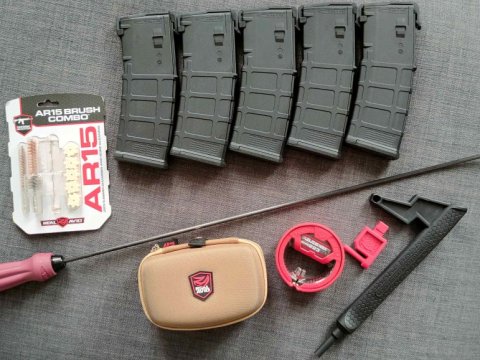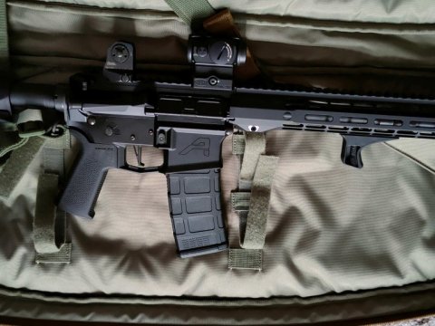 Aero Precision M4E1-T 14,5" 223rem, kolimátor Aimpoint Micro T1 na montáži Spuhr QDM-2002 Absolute T-1, pevná mířidla DanielDefense set, spoušť CMC 2-stage 2lb/2lb flat, Přední rukojeť BCM kag M-LOK, popruh Blueforce Gear Vickers Sling padded OD, zásobník Magpul Pmag M3 5ks, BCM QD endplate, Magpul QD M-LOK, pouzdro 5.11 42" SR Case + Condor molle pouch. Vystřeleno přesně 1219ks nábojů, čištěno pečlivě po každé střelbě chemie Boretech. V cenně 806ks 223. NORMA.