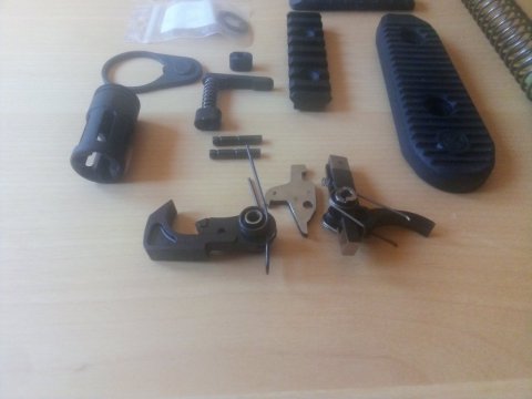 Prodám soubor dílů sundané z úplně nové zbraně, nikdy nevystřelena ani rána!! Vše Mil-Spec. Kompletní spoušť s leštěnými styčnými plochami, odlehčené pružiny spoustě od JP ENTERPRISES + originální pružiny, vypouštění zásobníku, Flash Hider A1 1/2x28, nové podložky pod úsťovky od Ascalon Arms rozměr viz.foto, back plate, raily 2x Magpul 1x UTG, buffer + pružina, botka pažby Magpul. PRODEJ NEJLÉPE KOMPLET!!!