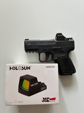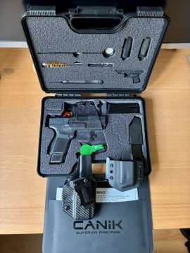 Prodám pistoli Canik Mete MC9, ideální na skryté nošení. Kupována 07/25. Nástřel do 500 továrních S&B, občas nošena. Stav nové zbraně. Ke kompletnímu balení navíc 1 zásboník na 12, tzn celkem 3 zásobníky. Přidám IWB pouzdro od ONGEAR holsters na zbraň a OWB pouzdro na 1 zásobník. K pistoli mohu přidat kolimátor Holosun HS507K X2 za 7500 Kč. ZP a NP podmínka. Praha 6.