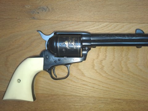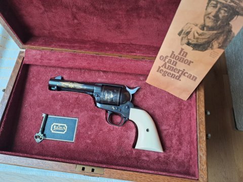 Nabízím k prodeji Colt 1873- edice John Wayne, ráže 45 Colt, hlaveň 4,25ˇˇ. Dodáváno v kazetě s klíčem a pamětní plaketou. Rukojeti ze slonové kosti. Zbraň se nachází v top stavu. Nutné NP + ZP