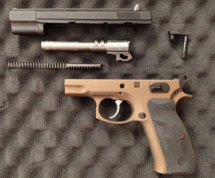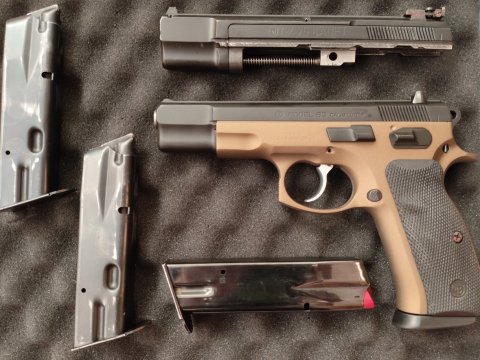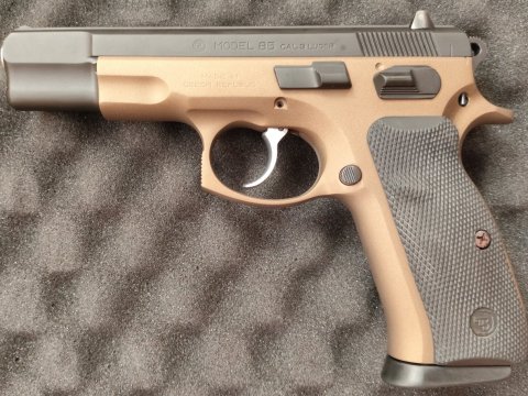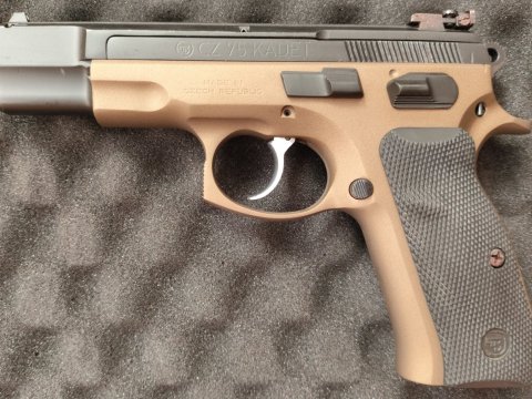 Prodám pistoli CZ 85, ráže 9mm luger v barevné úpravě Cerakote bronze/black, pryžové střenky (originál plastové přibaleny), dva zásobníky na 16 nábojů, jeden s gumovou botkou. Zbraň je v sadě s adaptérem CZ 75 Kadet v ráži 22 LR + dva zásobníky 22 LR, mikrometrická mířidla. CZ 85 a adaptér jsou slícovány, stačí jen vyměnit závěry, vše funguje. Zbraně uloženy v jednom kufru. Nutno ZP + NP. Nákupní povolení je třeba dvakrát, jedná se o dvě samostatné zbraně.