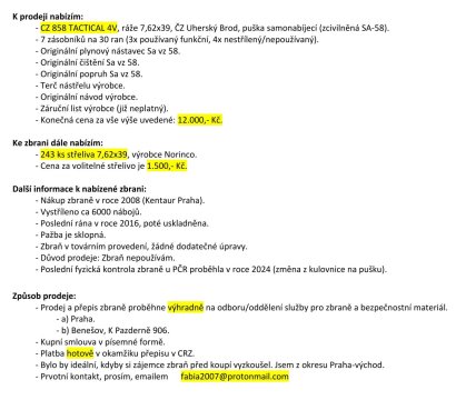K prodeji nabízím: - CZ 858 TACTICAL 4V, ráže 7,62x39, ČZ Uherský Brod, puška samonabíjecí (zcivilněná SA-58). - 7 zásobníků na 30 ran ... ... zbytek textu inzerátu je v druhém obrázku.