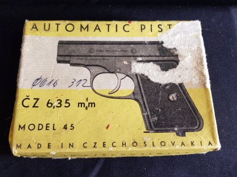 Samonabíjecí pistole CZ vz.45, 6,35mm Browning - klasické provedení. Příslušenstvím je originální krabička a jeden původní zásobník.