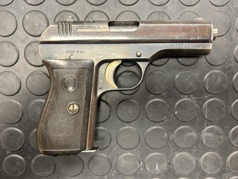 Pistole samonabíjecí výrobce Česká zbrojovka, a. s. v Praze model 27, rok výroby 1945, ráže 7,65mm. Pistole sloužila u České pošty (značena ČSP). Pistole je celkově v dobrém stavu. Hlaveň bez poškození vývrtu a uzamykacích ozubů. Původní brynýr. Ke zbrani je jeden zásobník a podpažní pouzdro. Zbraň kategorie B.