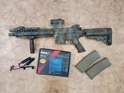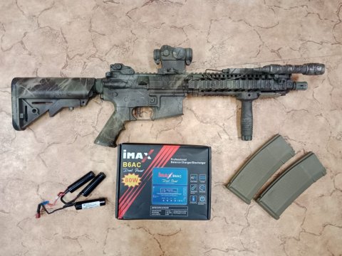 DD mk18 Edge 2.0. v zakladu , krylon , kolimátor , svítilna , spínač , dva zásobníky , baterie , nabíječka . Vystřelen necelý pytel 4000 kklí .