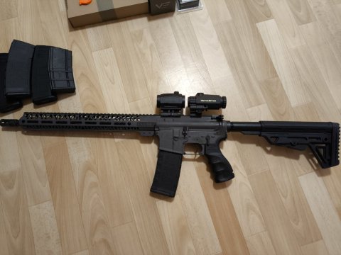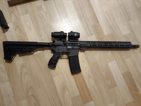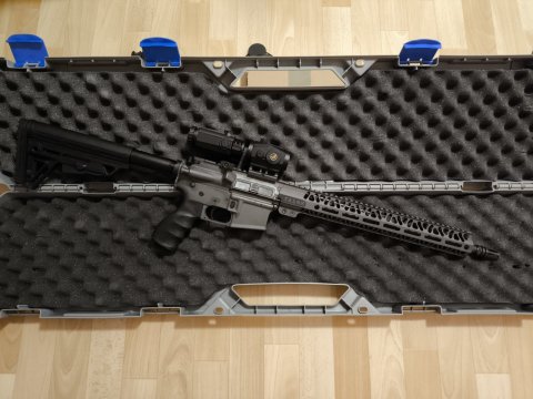 Nabízím k prodeji Ar 15 Gryphon ráže 223/5.56,hlaveň 16 palců,tlumičem výšlehu A2,teleskopiskou pažbou Alpha,odlehčeným předpažbím MLOK v délce 15" a přepravním kufrem.Prodávám pro nevyužití.. Na zbrani nové doplňky jako stavitelný gasblock od firmy strike industries vhodný pro tlumič.Vratná pružina a buffer od stejné firmy. Dále pistolová rukojet fab defense, zásobníky Magpul, kolimátor a lupa vector optics. Ke zbrani přidávám původní díly, čištění, kufr, 4x zásobník 30ran a 1x zásobník 10ran