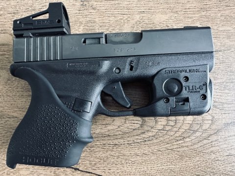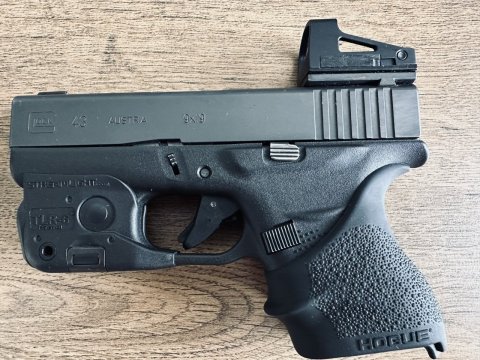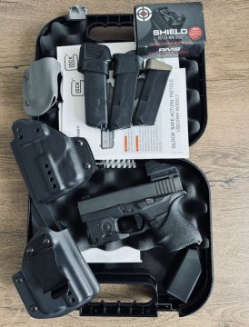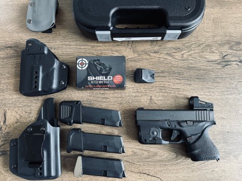 Malo noseny. STAV A1. Nastrileno 715 vystrelu. Cena KOMPLETU PRES 45 000,- Pri rychlem jednani SLEVA. Duvod prodeje : Glock 43 mi velikostne nesedl a lezi v trezoru…. Glock 16 100,- Tlr6 s cerv.laserem 5300,- Montaz kolimatoru Zendl 1800,- Kolimator SHIELD RMS 14 000,- Zasobnik 1000,- Prodlouzeni FAB DEFENCE na 10 naboju 660,- Grip HOGUE 600,- Pouzdro RH holster vnitrni 2425,- Pouzdro VNEJSI RH vcetne spony 2300,- Pouzdro zasobnik RH 1000,- prvni info sms nebo wa prosim