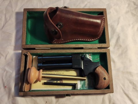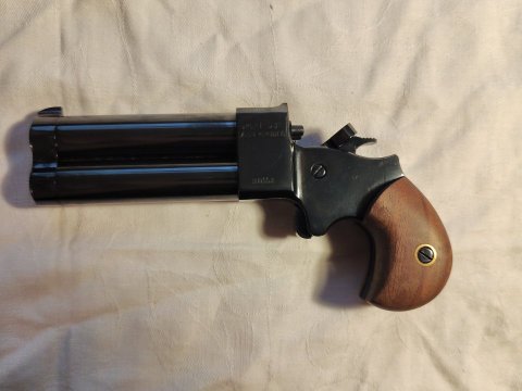 Prodám derringer od firmy Great Gun, ráže .45, délka hlavní 3 palce, s originální krabičkou, opaskovým pouzdrem, nabijákem, klíčem na pistony. Pouzdro má trochu delší pásek. Po vycpání dna pouzdra pásek drží zbraň dobře. Vystřeleno cca 30 ran. Udržovaný, čištěný, promazaný. Není nutné ZO, ale aspoň zbrojní autorizace ano. Po domluvě možnost přidat nějaké střely a zápalky.