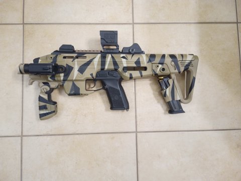 Během vteřin vytvoří z pistole subtilní karabinu s úplně jinou dynamikou. Nemůže se samozřejmě rovnat klasické karabině, ale zcela změní její operační použití. Celá konverze je v barvě Krylon. Je osazena kolimátorem Vector Optics FRENZY Plus SOLAR se zvýšenou montáží i sklopnými mechanickými mířidly. Svítilnou Fenix GL19R kompatibilní, jak s karabinou, tak s pistolí. Ke konverzi je i taktický vak zachycující vystřelené nábojnice a v neposlední řadě přepravní kufr.