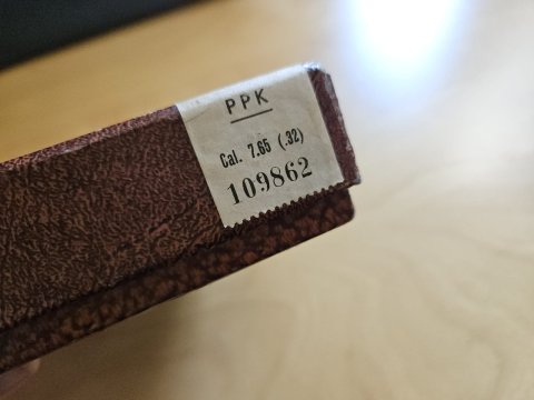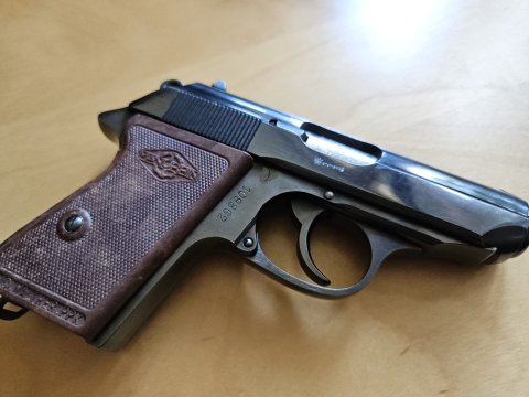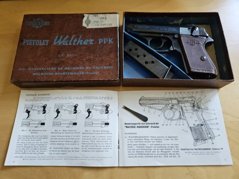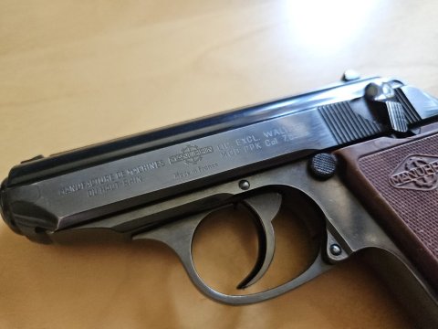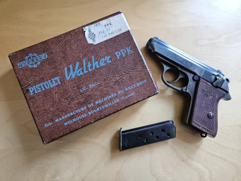 Nabízím Walther PPK vyráběný licenčně ve Francii v době, kdy Německo nesmělo vyrábět zbraně, jinak je to přesně Walther. Ráže 7,65 mm Browning. Výborný sběratelský stav se sčíslovanou krabičkou a originálním zásobníkem, platná zkušební značka. Původní bakelitové střenky (pozor, slepované, lze koupit nově dřevěné). Jen vyzkoušeno na střelnici.