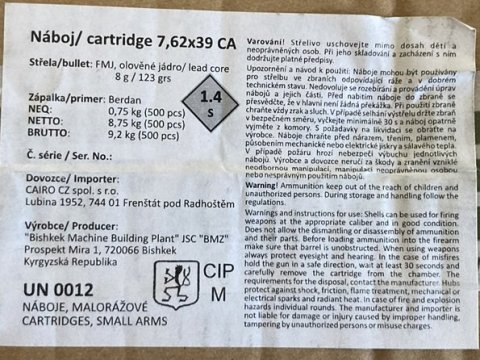 Prodám náboje ráže 7.62x39. K dispozici 2500ks olověné jádro, výroba munička Biškek, cena 7,50,-/ks baleno po 500 ks. Při odběru všeho přidám 2 hermetické muniční bedny.