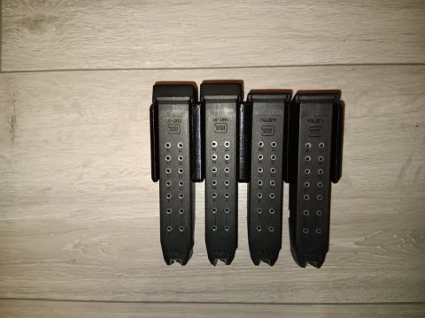 Nabízím k prodeji nový držák na 4 dvouřadé zásobníky Glock. Na první fotce je zleva zásobník na 33, 19, 17 nábojů. Držák je z polykarbonátu. Zásobníky nejsou součástí prodeje, cena pouze za držák.