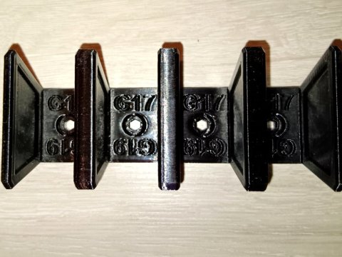 Nabízím k prodeji nový držák na 4 dvouřadé zásobníky Glock. Na první fotce je zleva zásobník na 33, 19, 17 nábojů. Držák je z polykarbonátu. Zásobníky nejsou součástí prodeje, cena pouze za držák.