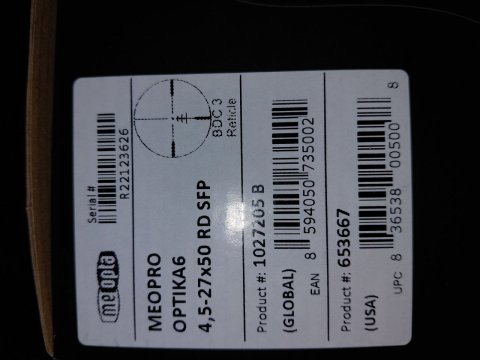 Prodám puškohled Optika6 4,5-27x50 RD SFP Záměrná osnova BDC 3. Zakoupen 27.4.2025 v Meoptě, registrovaná záruka na 10let. Nastříleno do 50 ran 223Rem, Příslušenství sluneční clona, flipOff krytka objektivu