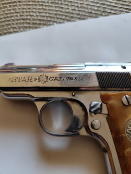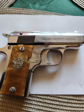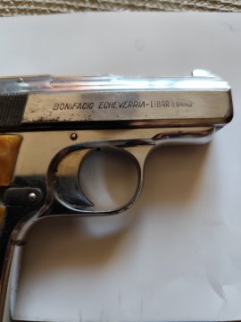 Španělská pistole Bonifacio Echeverría Eibar, model H, asi z roku 1935, je vyrobená na zakázku, v chromu a střenky jsou pravděpodobně ze želvoviny nebo plast, pro dřívějšího majitele. V dobrém stavu. Po kontrole PČR. V této ráži velice neobvyklá. Pěkná. Vhodná pro sběratele. Zbrojní průkaz nutný. Převod na PČR nebo znehodnotit pro sběratele