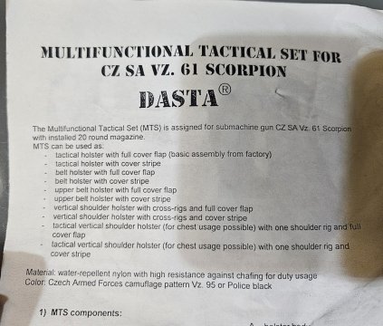 Pouzdro taktické na samopal Škorpion vz. 61 Dasta® 272C vz.95. Nepoužité. Kvalitní taktické pouzdro na samopal vz. 61 Škorpion, nebo samonabíjecí pistoli Scarabeus 06, plně nastavitelné dle potřeb uživatele. Vyrobené z vodě a oděru odolného nylonového materiálu v lesním potisku vzoru 95 používaného AČR. Výrobek české značky Dasta®. Původní cena 1.245,- Cena: 800,- osobní odběr Znojmo popř Zásilkovna připočítá se k ceně.