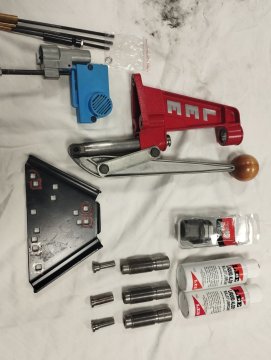 Lis LEE 1300kč,kontrola prachu Dillon 1000kč,kalibrační matrice 0.309",0,451",0,358" kus 300kč,pojistné kroužky matric sada 6ks 500kč,ocelová montážní deska LEE 200kč,mazadlo LEE Alox (1x nenačaté v jednom 3/4)obě za 200kč