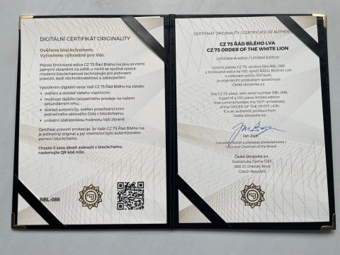 Prodám CZ 75 Řád Bílého lva – 100 kusová limitovaná edice ke 100. výročí Řádu Bílého lva, výr. č. RBL - 088. Jsem první majitel, nepoužitá zbraň ve stavu, ve kterém opustila podnikovou prodejnu. S kompletním příslušenstvím, kufřík, kazeta, certifikát. ZP a NP podmínkou. První kontakt prosím emailem, uvedený tel. je smyšlený, předem děkuji.