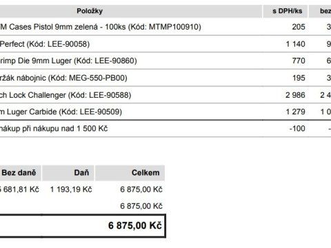 Dobrý den prodám kompletní přebíjecí sadu na přebíjení nábojů 9mm luger. Přikládám i faktury z pořízení pro přehled co tam všechno je. Přidám zdarma i setinovou váhu pro změření správného dávkování prachu dávkovačem. Jedná se o low budget sadu s cílem minimalizovat vstupní investici a naučit se přebíjet, časem je určitě vhodné nahradit jednooperační lis víceoperačním pro úsporu času. Sada nepřebila žádný náboj, kvůli nedostatku času na její sestavení a střílení celkově. Děkuji za pochopení.