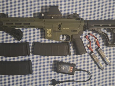 Prodám Delta Armory M4 AR15 M-LOK SilentOps 10" Charlie EAGLE Oliva 2x baterie 11,1V 1100mAh delta armory Taktická přední rukojeť Kolimátor ET551 Guerilla Optics Nabíječ Li-Po baterií BO3 PRO 3x zásobníky Stav: nová (vystřeleno 200 nábojů) Originálni krabice je trochu roztrhaná