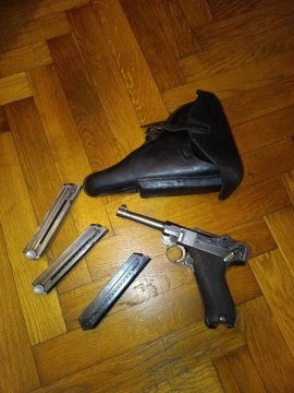 Prodám legendární Mauser P08 výroba 1936 bez svastik. Značení S/42 výrobní továrna Mauser. Skrytá zkušebna. K zbrani je třetí nový zásobník. Ke zbrani je originální pouzdro v ceně i druhé neoriginální novovýroba. Na zbrani jsou originální střenky navíc i druhé novovýroba. Dále přidám střelivo z druhé světové války ročníky. Zbraň je v perfektním A1. Vše mohu prodat samostatně pistoli, zásobníky a originální značené pouzdro vyrobené v roce 1939 v Bensbergu se zbrojní inspekční značkou WaA727
