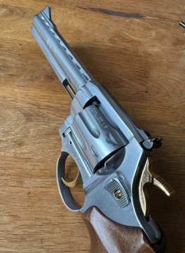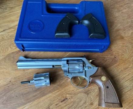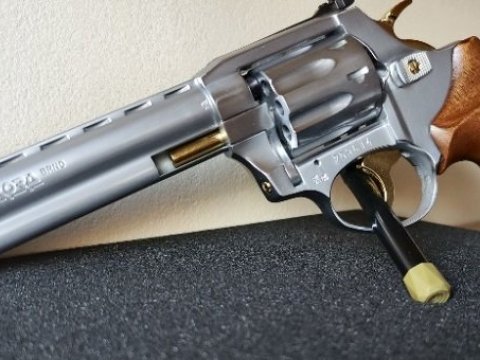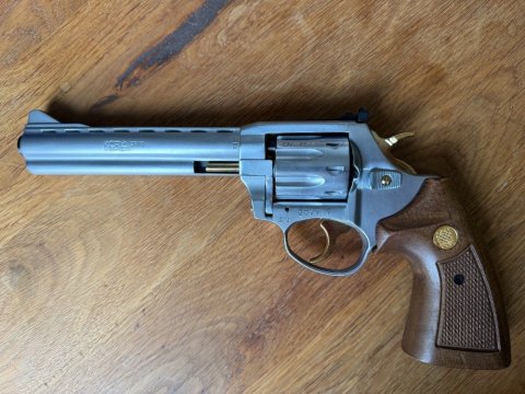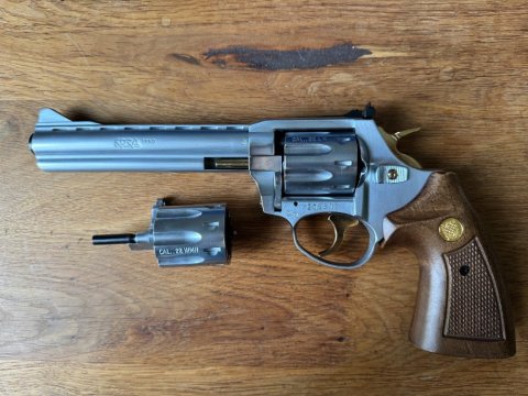 Revolver: KORA, Hlaveň: 6", Ráže: 22LR, Provedení: Matný chrom, se zlacenými prvky, Bubínek: 8-mi komorový. Součásti zbraně je druhý bubínek v ráži: 22 WRM. Originál kufr, náhradní střenky. Je možné prodat bubínek WRM samostatně.