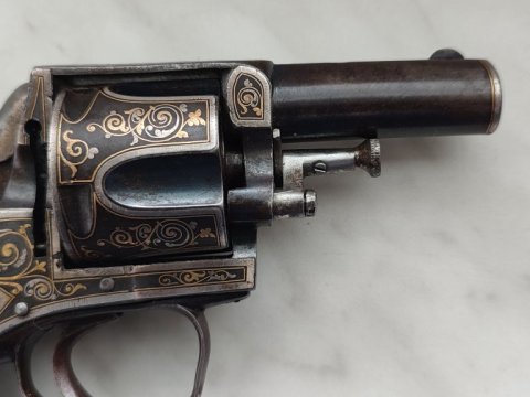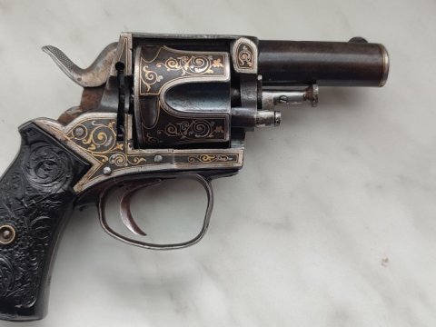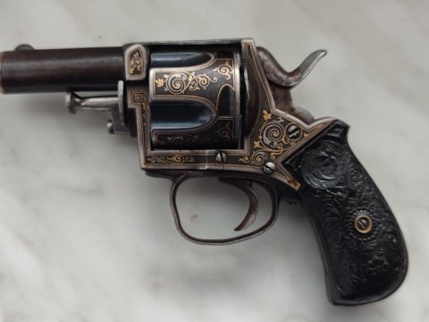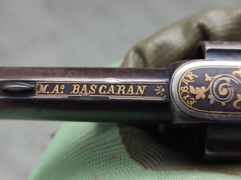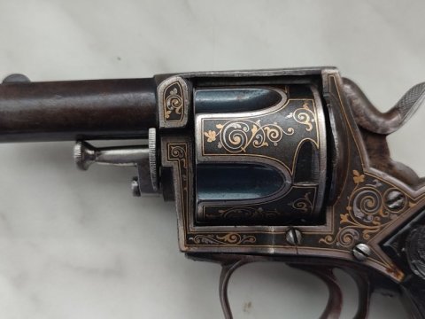 Prodám Revolver Continental Bull Dog .45 - značen M.A. Bascaran (nejspíše výrobce zbraní Trifón Bascaran Arambarri).Jedná se o opravdu nádherný a unikátní kousek,s krásnými a vzácnými zlatými intarziemi.Tato povrchová úprava je původní.Zbraň je určená k opravě!!! Revolver funguje v režimu DA, ale spoušť je třeba zatlačit dopředu. Zbraň nedrží kohoutek v režimu SA, ale nejsem si jistý, zda byla zbraň navržena pro fungování v režimu SA + chybí krytka otvoru pro nabíjení revolveru.