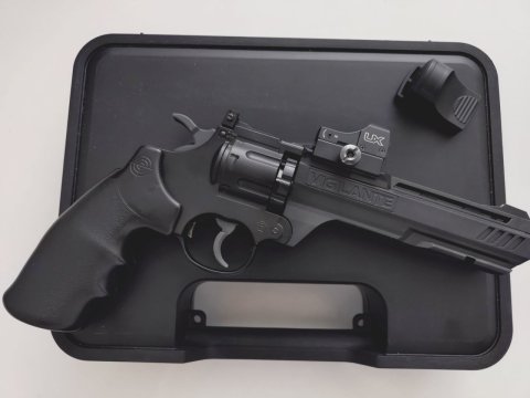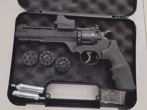 Ráže 4,5mm, pohon bombička 12g CO2, na diabolky i ocelové broky (nepoužíval jsem), 3 zásobníky/10ran na diabolky, 1 zásobník/6ran na ocelové broky, kolimátor Umarex Nanopoint 3, plastový kufřík, při osobním převzetí přidám i originál krabici, zbraň je zánovní v záruce, dotuněná, střílí slušně přesně a je silná (s některým střelivem naměřeno přes 7J). Při rychlém jednání přidám pár bombiček a nějaké střelivo.