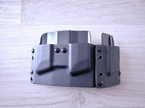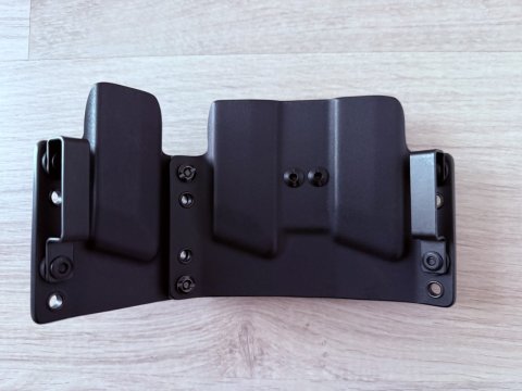Prodám OWB kydexová pouzdra RH Holsters – dvojité pouzdro na 2× zásobník Glock 43 a jednoduché pouzdro na 1× zásobník Glock 43, pevně ale rozebíratelně spojené pomocí Chicago šroubů od Ulticlipu; ideální pro tréninky a kurzy, kde se u této zbraně rezervní zásobník opravdu hodí. Spojení překvapivě dobře sedí a ergonomicky kopíruje tělo. Určeno pro praváka, vnější nošení, Speedloops 40 mm. Pouzdra jsou ve výborném stavu, cca 4× použitá na střelnici, nenošena. Osobně v Brně nebo Zásilkovna (+89 Kč)