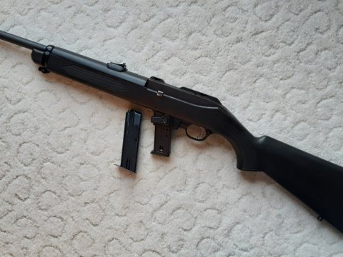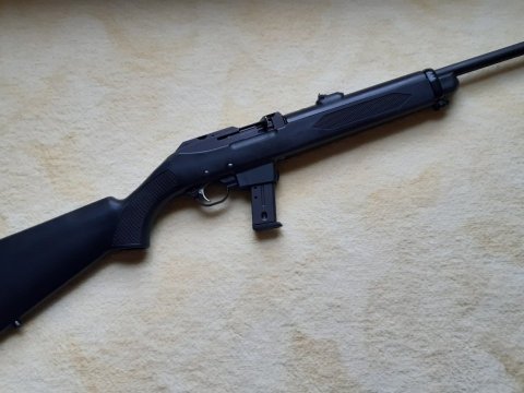 Prodám tuto dnes již málo vídanou karabinu Ruger PC9. Oproti současným modelům dostupných na trhu byla vyrobena pro speciální policejní jednotky. Vyznačuje se velice odolným provedením se spolehlivou funkcí. Má jako jedna z mála uzamčený závěr, takže se při střelbě chová velice klidně a perfektně drží záměrnou. Podobné střílení jako s M1 Carabine, ale mnohem levnější. Po malé úpravě lze použít i zásobníky do CZ 75.