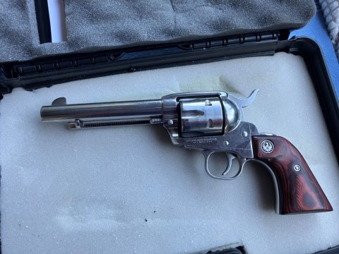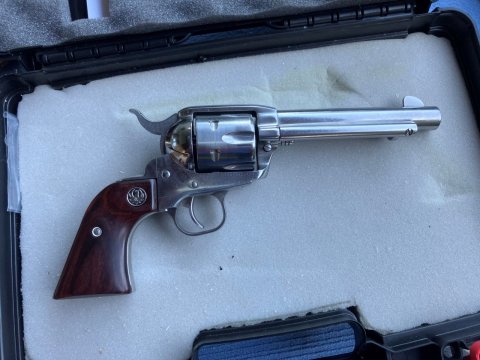 Prodám SA revolver Ruger New Vaquero, ráže ,357Mag/,38Sp, nerez, dl.hlavně 5,5". Nová zbraň, vystřeleno 100 ran. Důvod-nemám na westernové střílení čas.