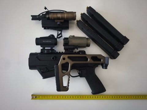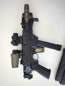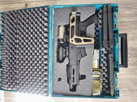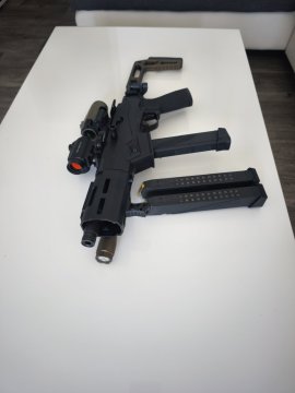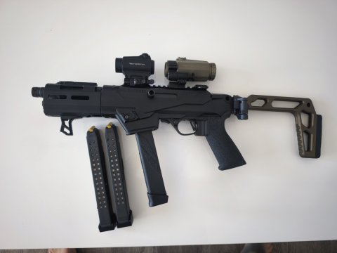 Nabízím pistole samonabíjecí od amer. výrobce Ruger na zásobníky Glock, těžká hlaveň 6,5 závit 1/2"-28, chodí bezchybně i s odzkoušenými tlumiči, nástřel 900 ran, spoušť Tandemkross, originál přidám, sklopná pažba na RIS lištu, svítilna s tlakovým spínačem 280Lm, poutko na řemen, kolimátor 3MOA, magnifier 3x, zásobníky Glock 3 x 33, civilní přepravní kufr, rozložená zbraň 30cm, složená a schopná střelby za 2s, rozložení bez nářadí, PC. přes 40.000,-