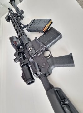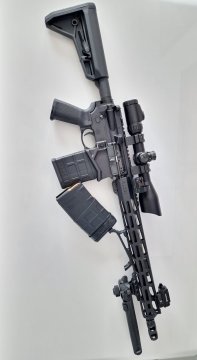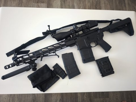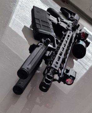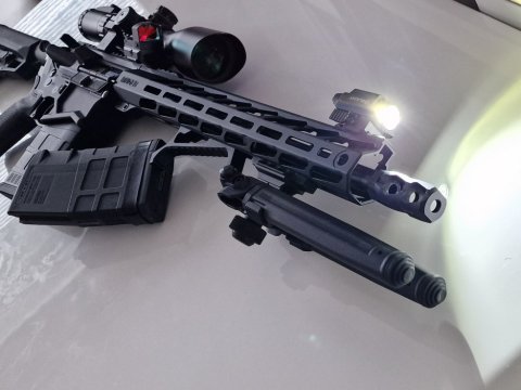 Nabízím prakticky novou, pušku amer. výrobce s délkou hlavně "16" v ráži 308 Win., break-in hlavně, celkem vystřeleno 115 ran, je to platforma lehké AR15 ne AR10, doplňky Magpul (bipod, pažba, ručka, zásobníky PMAG 20 ran 2x), úsťová brzda, kolimátor 3MOA na 45° s mířidly, optika UTG 2-16X44 UMOA, světelný kříž zelená/červená, nebo 36 barev, leptaná osnova, sumka na zásobník, lapač nábojnic, popruh Custom Gear, obal na přenos. PC 58000,- nyní 44000,+ 435 ks po 16,- 6960, jako celek za 50000,-