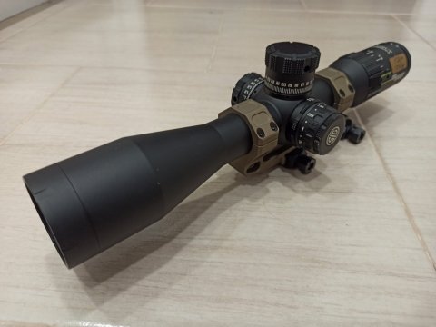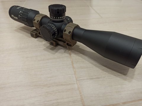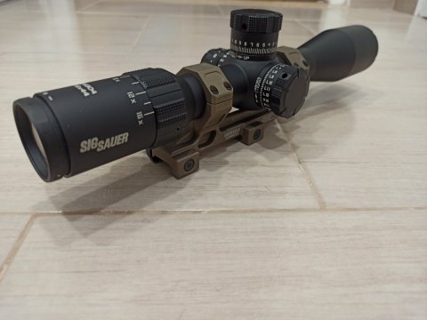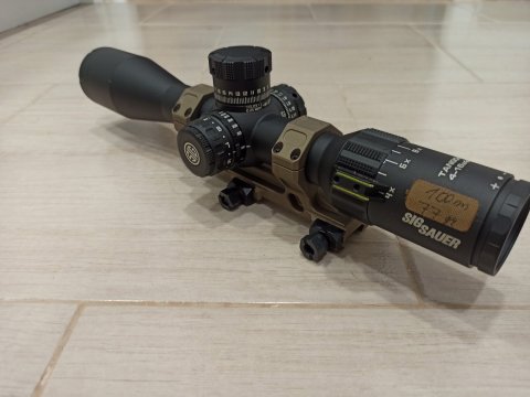 Puškohled Sig Sauer Tango4 4-16x44, FFP, 1/4 MOA klikání, podsvícená TMR osnova. Koupený v srpnu 2023, namontovaný ve fantastické 30mm montáži Geissele Super Precision (na utahovacích šroubech drobné poškození způsobené přílišným utažením, ale funguje na 100 %). Má za sebou cca 1000 nábojů .223 Rem (plynová AR-15, pušková délka, takže žádná velká námaha).