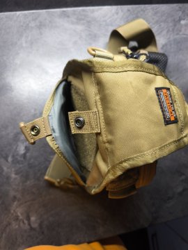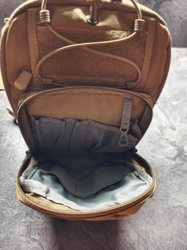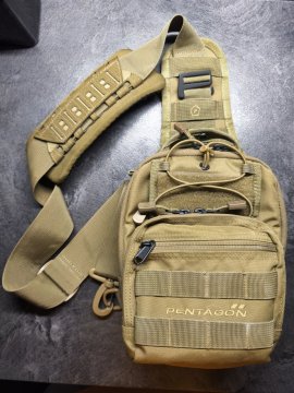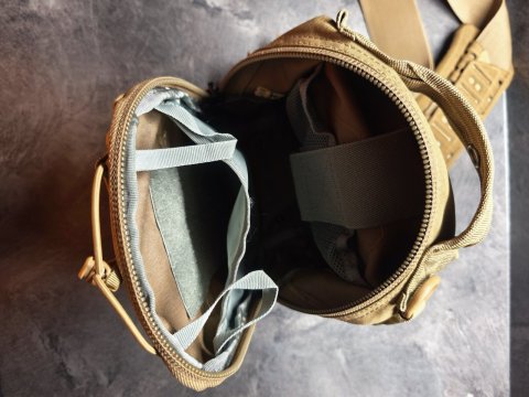 1 hlavní přihrádka s 2 přihrádkami uvnitř, zipy YKK®. V jedné části je místo pro zbraň, která se připevňuje k elastickému popruhu, v druhé na mobil, peněženku atd. Z vnější strany je další kapsa na zipy. Uvnitř jsou přihrádky na pera, nůž, svítilnu, karabinka na klíče a další. Panel na suchý zip. MOLLE pro připevnění dalšího pouzdra na přední straně a na straně oka. Popruh je nastavitelný, v šířce 5 cm. Na popruh přidán tlumící neklouzavý panel. Taška je nová, nevhodný dar.