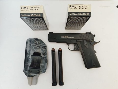 Taurus 1911 Commander 45 ACP. Nesedl mi, 2x na střelnici 200 bellotů prošlo hlavní za snad 3-4 roky nebo jak dlouho ho mám, občasně nošen. 2x zásobník 8ran a originální box se zámkem. Přidám IWB pouzdro pro praváka od ONGEAR v barvě Kryptek a zbylé asi 2 krabičky. kontakt mailem