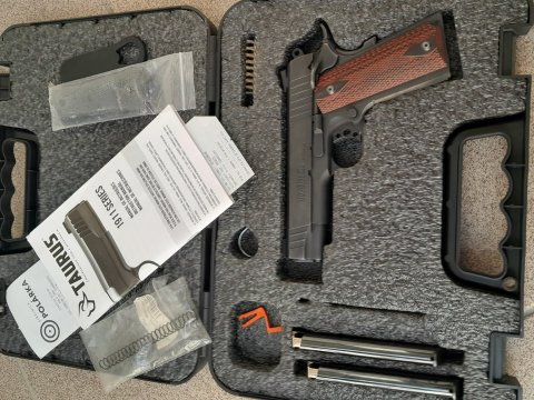 Taurus 1911 Commander 45 Auto, nastrel do 2000ks, koupeny 10/2022, spolehlivy, prvni majitel, baleni jako z obchodu plus nejake drobnosti navic ( drevene strenky, nahr. vratna pruzina, sroubky atp.) Vyroben fabrika v USA - Georgia, Pistole je paradne zpasovana. Pistole ma spoustu tuningovych prvku v zakladu z vyroby, Spoust je naprosto luxusni, navic stavitelna. Chod do odpaleni cca 2mm, reset stejne, odpor cca 1-1,5kg, Novak miridla, Hlaven je z nerezove ocele, Blokace uderniku.