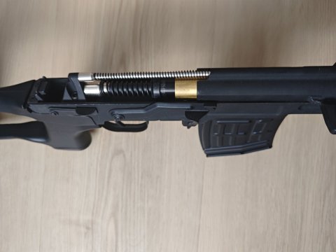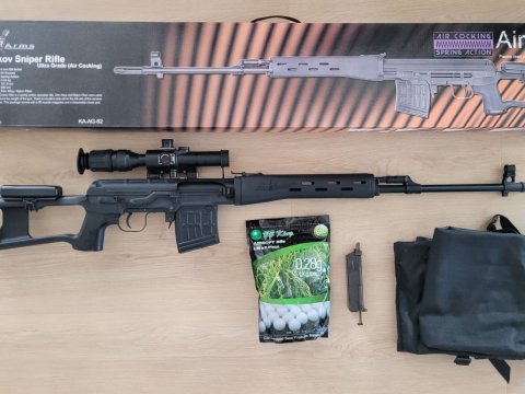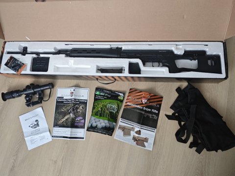 Prodám manuální odstřelovací pušku SVD Dragunov od King Arms (Ultra Grade, model KA-AG-82). Zbraň je v perfektním stavu, byla použita pouze dvakrát na zahradní střelbu, nikdy nebyla na airsoftové akci. Tělo je bez škrábanců, vnitřní mechanismus je čistý a promazaný (viz detailní foto otevřeného závěru). Optika - JJ Airsoft PSO-1 4×24 Illuminated Scope Replica; SVD Mount.(Pozn.: Optika je plně funkční a čistá, pouze podsvícení kříže je nefunkční kvůli poškozenému kontaktu při montáži).
