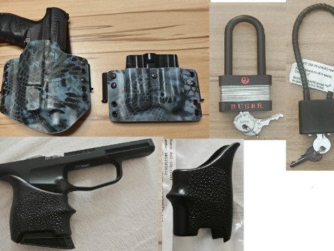 1, kydex pouzdro pro Walther PPQ SD Navy a svítilnu Inforce APLc. 1500Kč 2, kydex pouzdro pro 2x zásobník Walther PPQ/PDP. 1000Kč 3,Střenky/návlek Hogue Sig Sauer P365 nové 350kč/ks. Mám velikosti ruky M a líp si sedne/drží zbraň. Tlmí zpětný ráz při střelbě 5, Visací zámky/zámek/kladka Ruger a Sig Sauer k zajištění střelné zbraně. Jsou pogumované => šetrné ke zbrani. Nové. Cena 200kč/ks Zbraň jenom na ukázku. Není záruka. Praha, Praha-Brno-Zlín 1x/měsíc; pošta: 50kč balné +poštovní předem