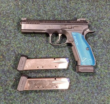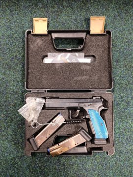 Zbrań ráže 9 mm Luger, zkušebna 2016, minimálně střílená do 200 ran. Ke zbrani originál kufřík s dokumentací (nástřelný terč, návod). 3 ks zásobníků.