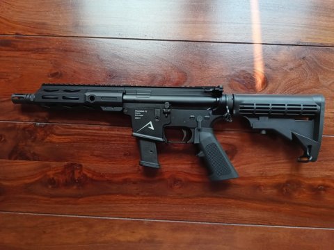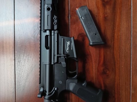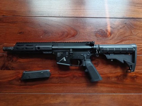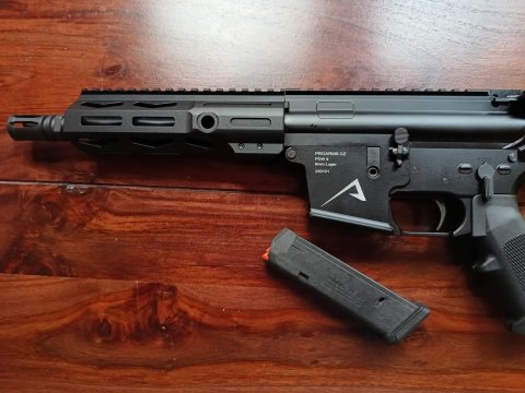 Prodám zbraň PDW na bázi pušek AR v ráži 9 mm na zásobníky Glock - zásobník na 17 ran v ceně. Předpažbí M-LOK. Délka hlavně 8". Pažba z Faxonu. Zbran kat. B, pistole samonabíjecí. Zbraň je v záruce, 100% stav. Vystřeleno pouze 25 ran na nastřelení kolimátoru. Od té doby nevyužitá, nyní potřebuji místo v trezoru, proto prodávám. Kontakt prosím na mail. Děkuji.